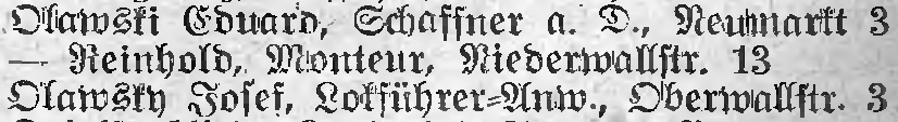 | Olawski Eduard, Schaffner a. D., Neumarkt 3 — Reinhold, Monteur, Niederwallstr. 13 Olawsky Josef, Lokführer-Anw., Oberwallstr. 3 |